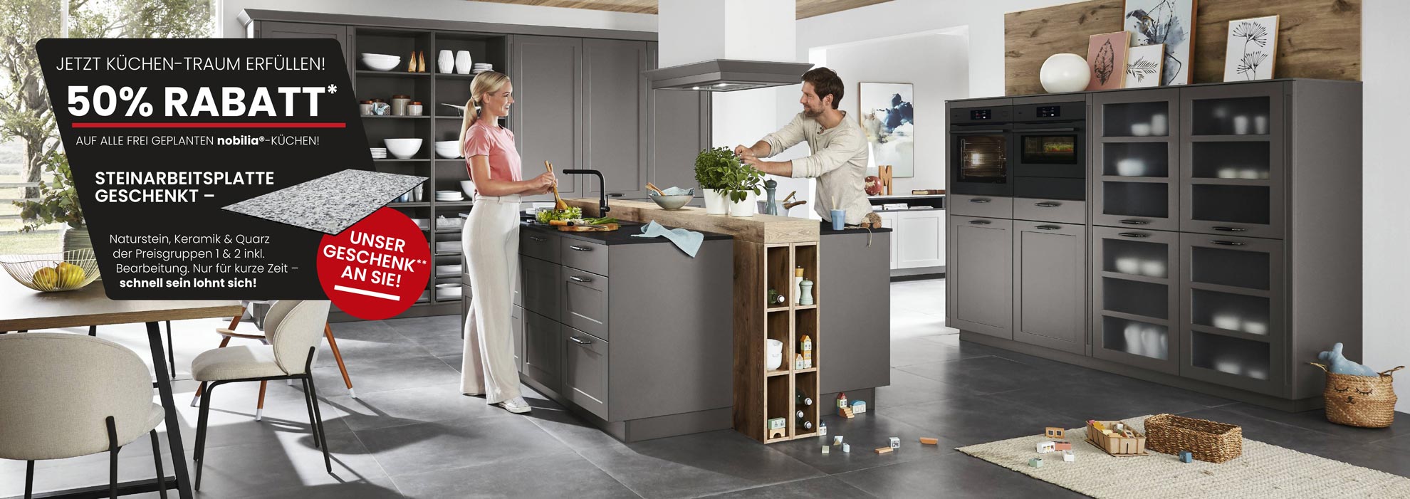 Beim Kauf einer frei geplanten Küche erhalten Sie eine Arbeitsplatte aus Naturstein, Keramik & Quarz der Preisgruppen 1 & 2 inkl. Bearbeitung kostenlos dazu**. Dazu gibt es noch auf jede frei geplante Küche von nobilia® 50% Rabatt*! Worauf warten Sie noch? Vereinbaren Sie direkt einen Termin zur Beratung oder kommen Sie einfach vorbei.