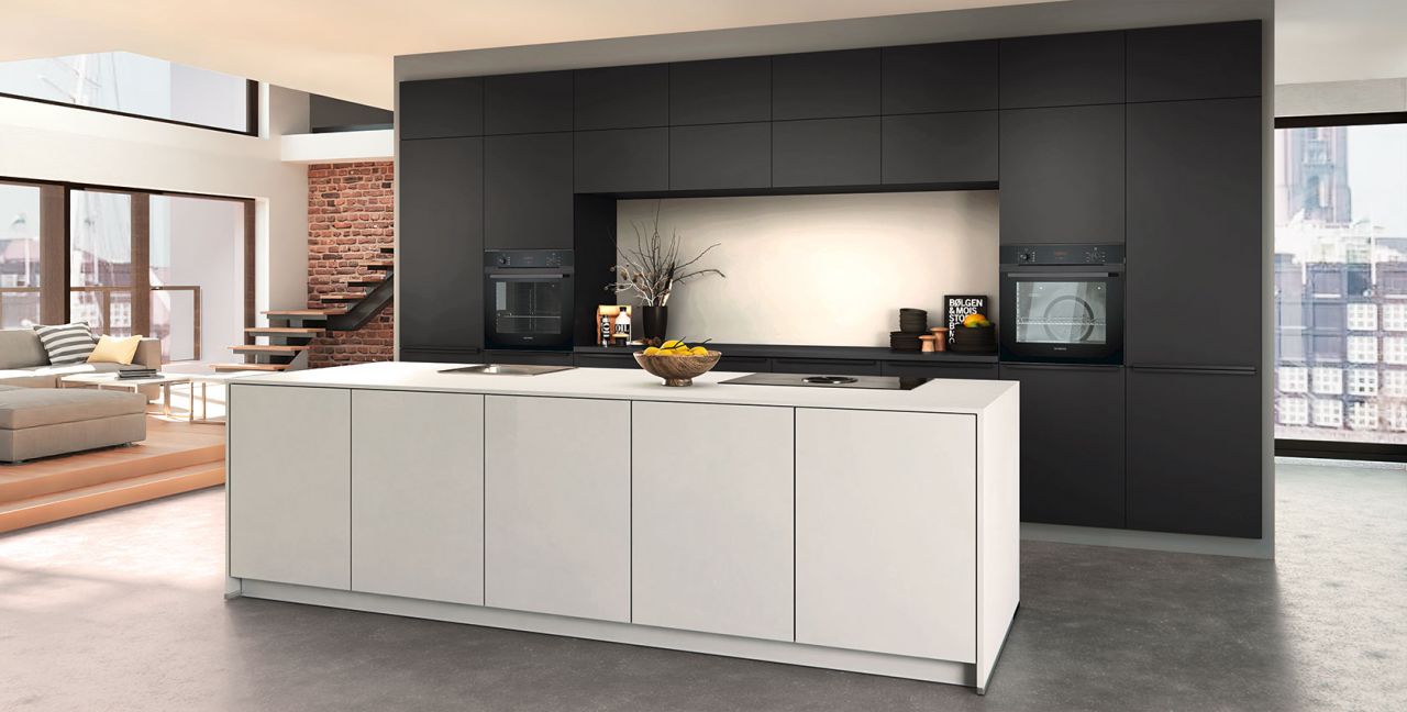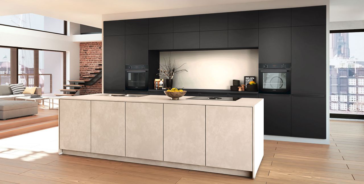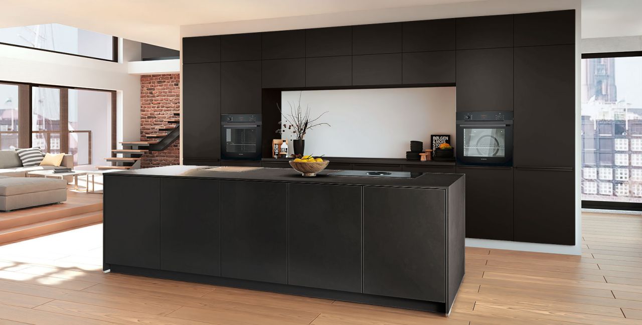 Inklusive 2x Einbaubackofen schwarz Siemens HB234ABB3 Energieeffizienzklasse A+, Glaskeramik Kochfeld mit Induktion und Kochfeldabzug (Umluft) Bora GP4U, Kühlschrank Laurus LKG88E Energieeffizienzklasse E, Einbauspüle Edelstahl Rodi NewManaus, Wandschränken mit Klappe, XL-Schränken.