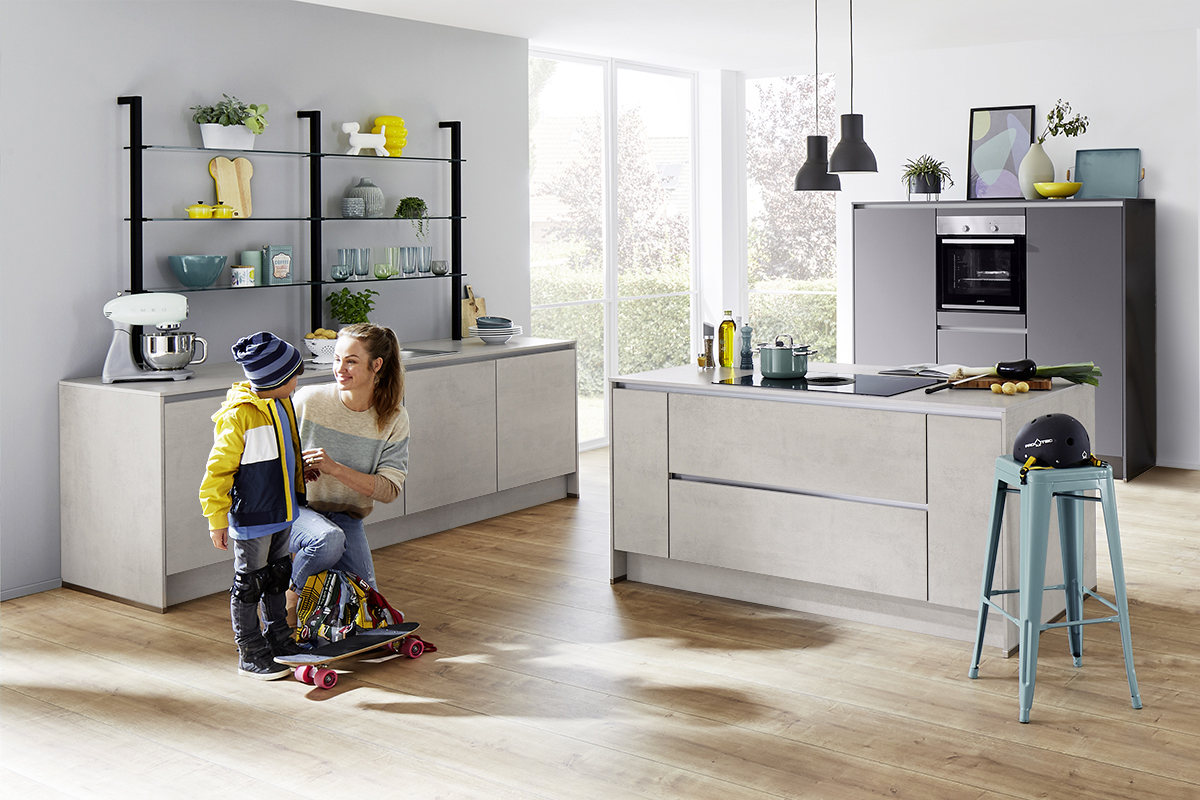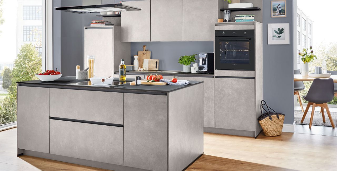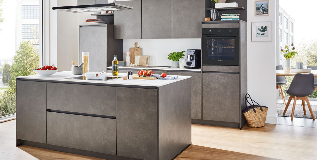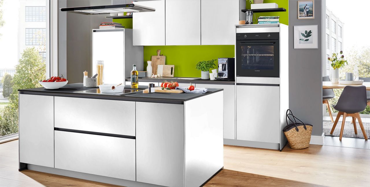 Inklusive Einbaubackofen Laurus LEB10BK Energieeffizienzklasse A, Glaskeramik Kochfeld Laurus LCA600, Inselesse Edelstahl Elica JOYE INSEL-A Energieeffizienzklasse A, Kühlschrank Laurus LKG88E Energieeffizienzklasse E, Einbauspüle Edelstahl Rodi Okio Line 85 Deep, XL-Schränken, Unterschrank mit Großraumauszügen, Wandborden.
