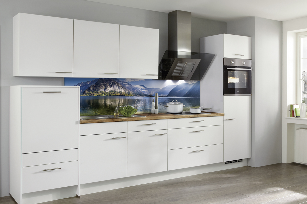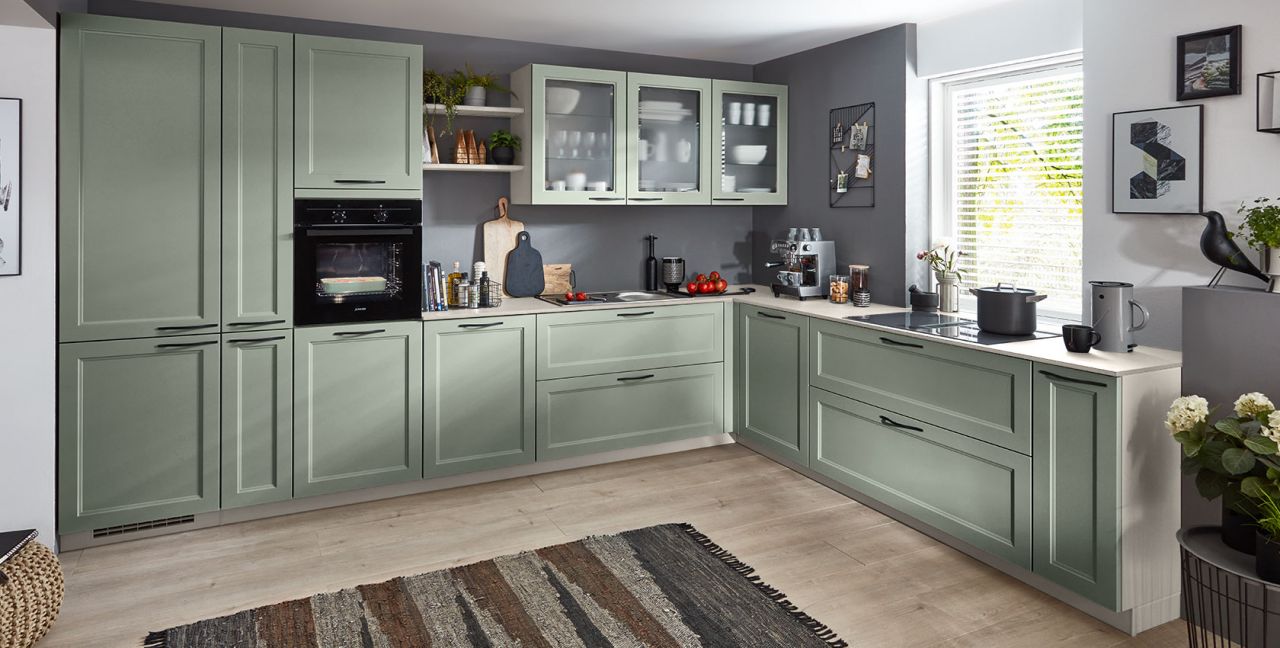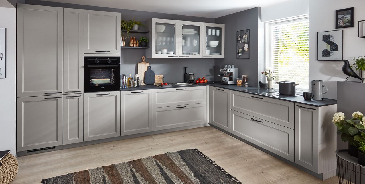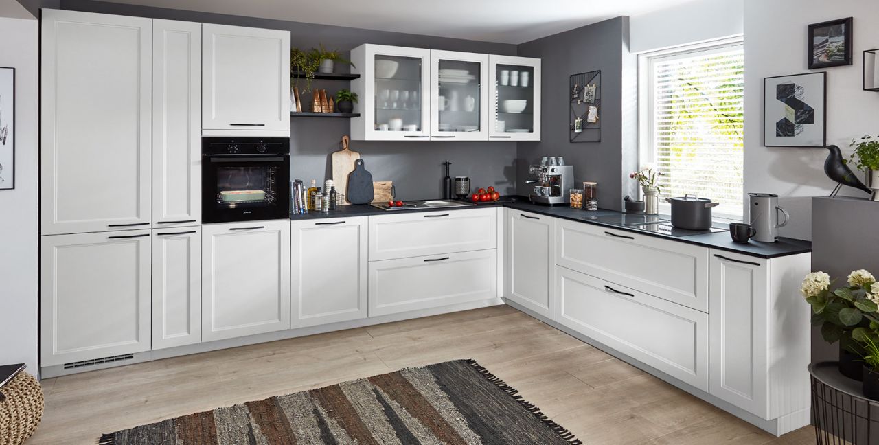 Inklusive Einbaubackofen schwarz Junker JF1300061 Energieeffizienzklasse A, Glaskeramik Kochfeld mit Induktion und Kochfeldabzug (Umluft) Xtra Hob XTRAVENT373F80, Kühlschrank mit **** Gefrierfach Progress PK0855 Energieeffizienzklasse E, Einbauspüle Edelstahl Rodi Okio Line 85 Deep, XL-Schränken, Unterschränken mit Großraumauszügen, Wandborden.