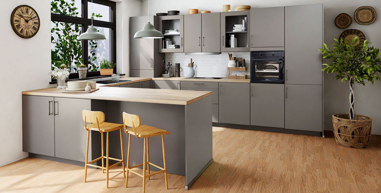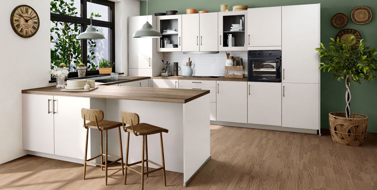 Inklusive Einbaubackofen schwarz Junker JF1300061 Energieeffizienzklasse A, Glaskeramik Kochfeld Junker JR36DT54, Flachschirmhaube Elica ELITE 14 60-D Energieeffizienzklasse D, Kühlschrank Laurus LKG88E Energieeffizienzklasse E, Einbau-Designspüle Elleci Logik 300, XL-Schränken, Unterschrank mit Großraumauszügen, Wandschränken mit Glassprossentüren, Esstheke.